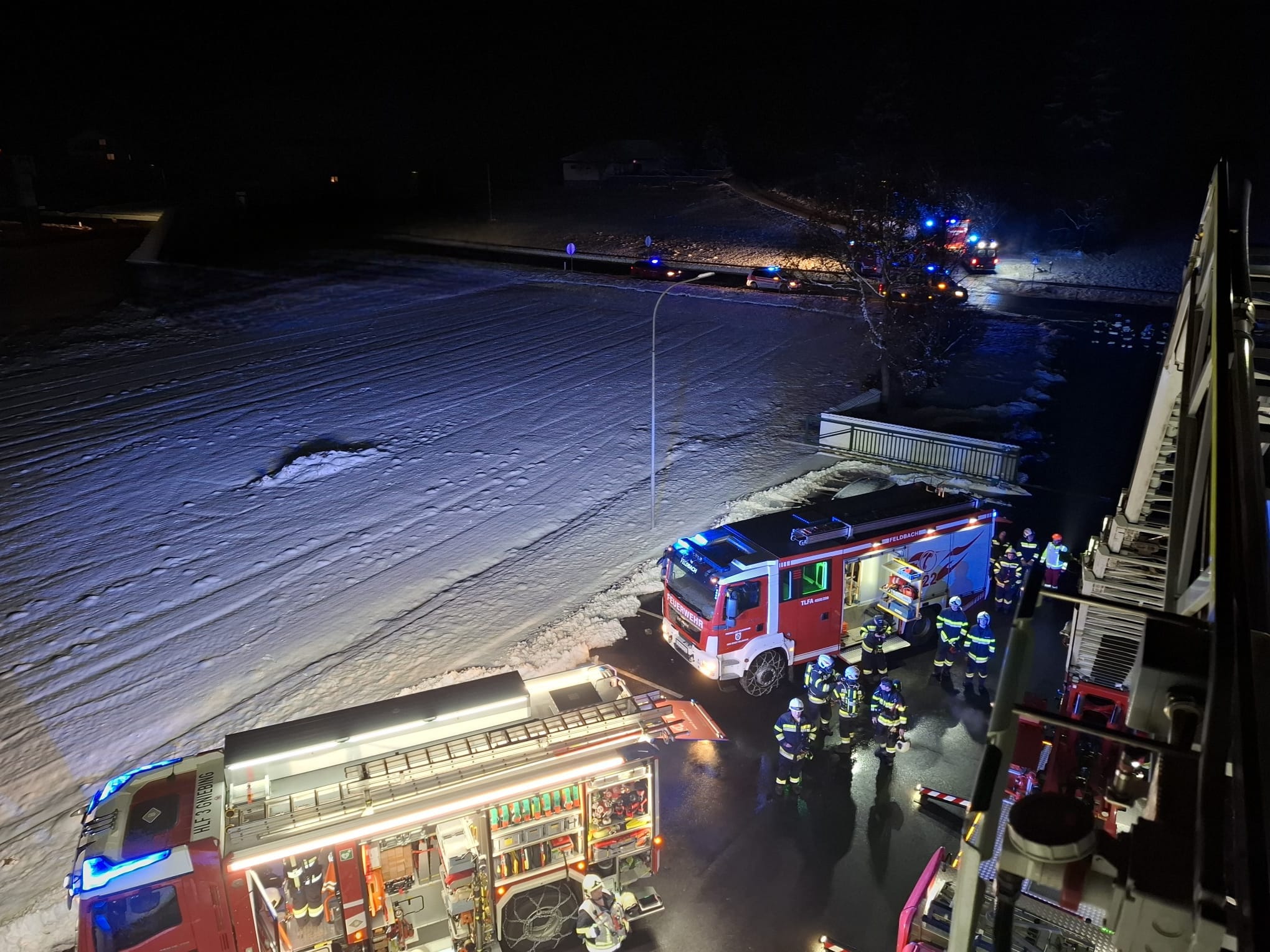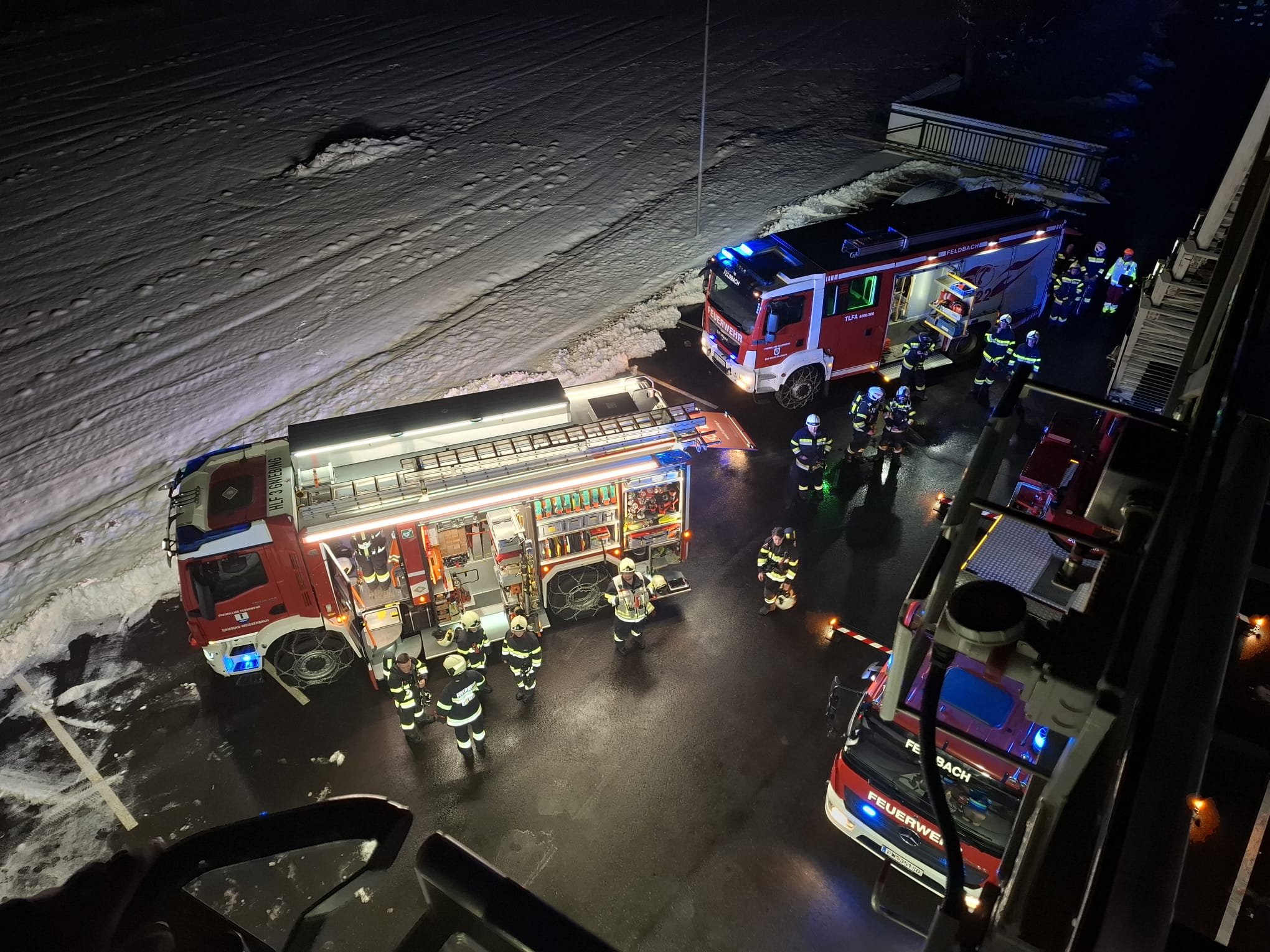 Eingesetzte Kräfte: Freiwillige Feuerwehr Feldbach mit DL-K 23/12, TLF-A 4000/200, sowie VF und 17 Personen, FF Gniebing (ortsansässig, einsatzleitend) und FF Rohr an der Raab mit insgesamt 6 Fahrzeugen und 24 Personen, Polizei, Rotes Kreuz